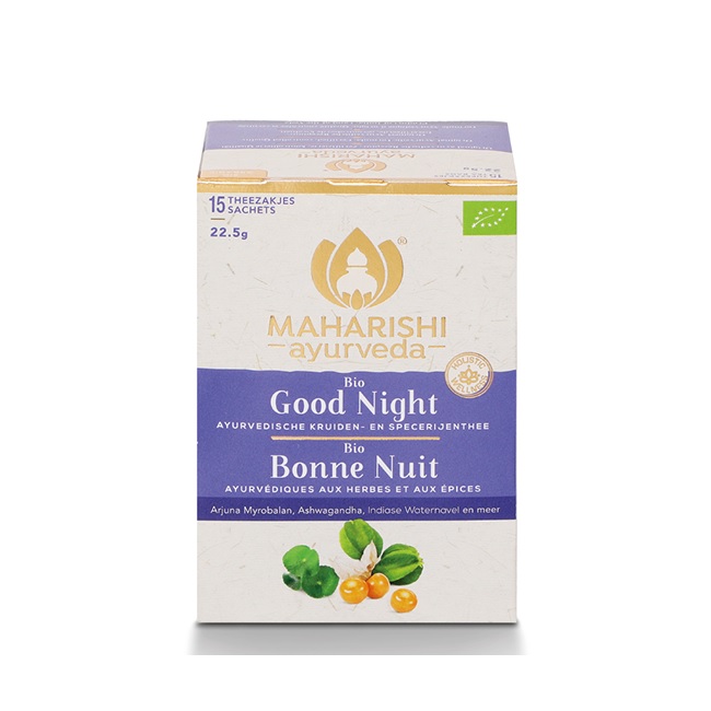 Ayurvedische kruidenthee Good Night (Goede Nachtrust) 15 theezakjes a 1.5gr. Ingrediënten: Zoethout, arjuna myrobalaan, winterkers, aarmunt, kardemom, koriander, pepermunt, Indiase waternavel, kleinbladerige bacopa, fenegriek, lange peper, zwarte peper, grote galangawortel, Amomum subulatum.