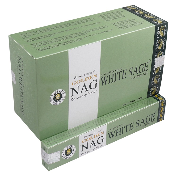 Golden Nag White Sage 15gr is een heerlijke wierook geur van masala. De geur komt voort uit de natuurlijke ingrediënten die men gebruikt. Zoals kruiden, harsen en Indiase specerijen (masala). Brandtijd: 45 min. Ze zitten per 12 pakjes wierook in een doos.