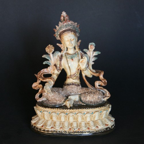 Tara is ontstaan uit de tranen die Avalokitevara uit compassie met alle wezen voelde. Tara heeft 21 verschijningsvormen in diverse kleuren. De Witte en Groen Tara zijn de oudste vormen. Haar naam staat voor het begrip “oversteken/mededogen”zij beschermt de mensen terwijl die de “Oceaan van het bestaan”oversteken.